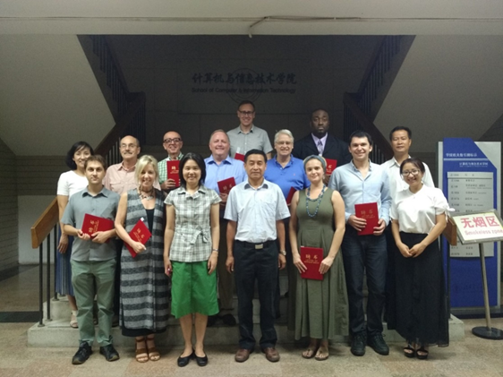 (搜书吧 计算机信息与技术学院蔡伯根院长、杨晓晖书记、董敬祝副书记与暑校授课教授合影)