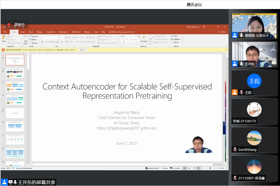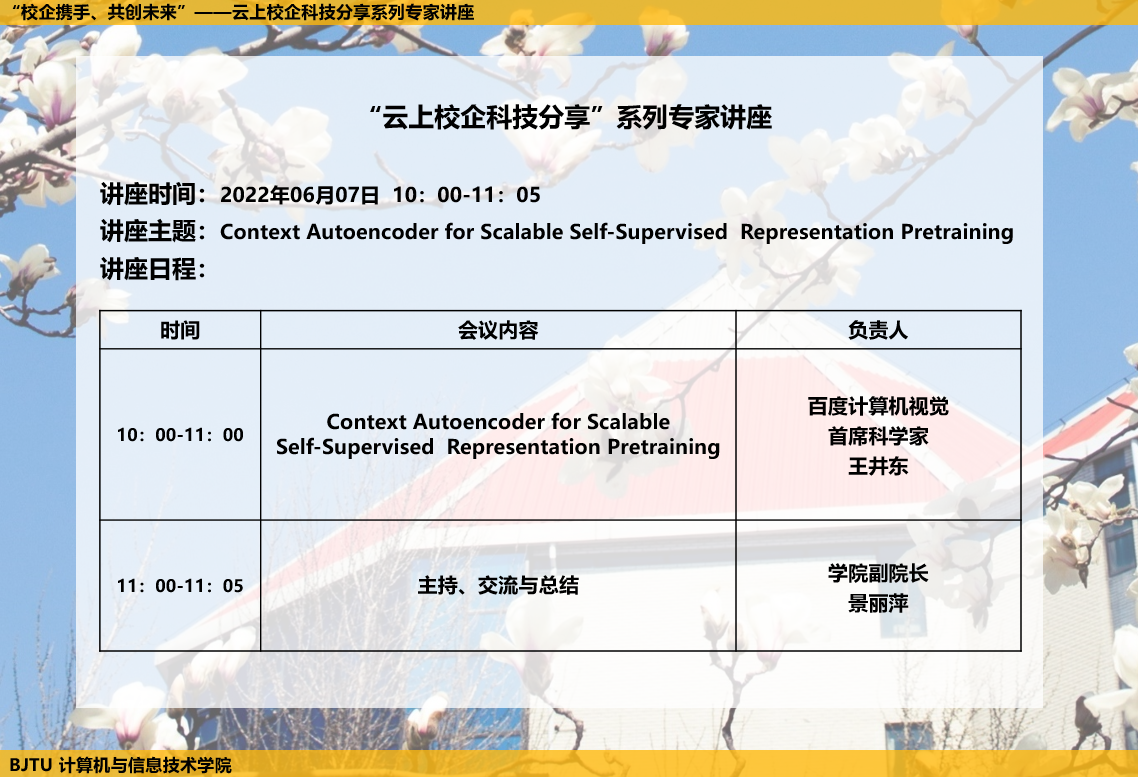 2022年6月7日上午,搜书吧 计算机与信息技术学院“云上校企科技分享系列专家讲座”活动有幸邀请到百度计算机视觉首席科学家王井东,讲座主题为 “Context Autoencoder for Scalable Self-Supervised Representation Pretraining”。160余位师生全程参与讲座。