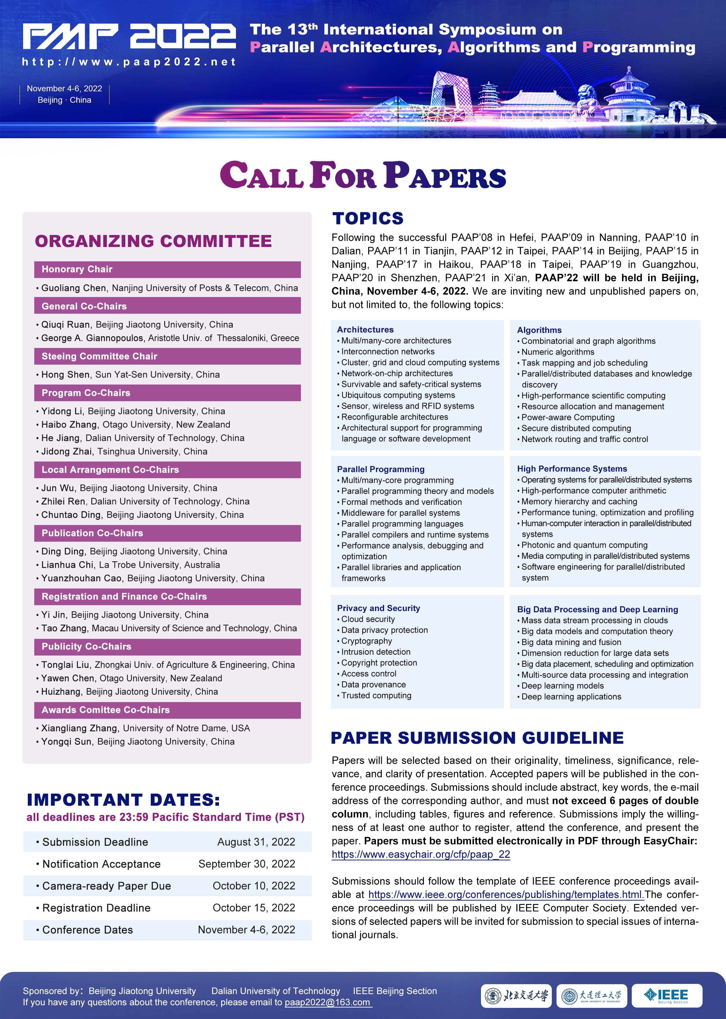 大会所有录用论文将收录至 PAAP2022会议论文集,通过审阅后进入IEEE Xplore, 并提交EI-Compendex, Scopus 等检索机构检索。优选论文的扩写版本将推荐给多个 SCI 索引的国际期刊的特刊(专刊),包括International Journal of Intelligent Systems,Computers and Electrical Engineering,Computer Science and Information Systems, Concurrency and Computation: Practice and Experience等。