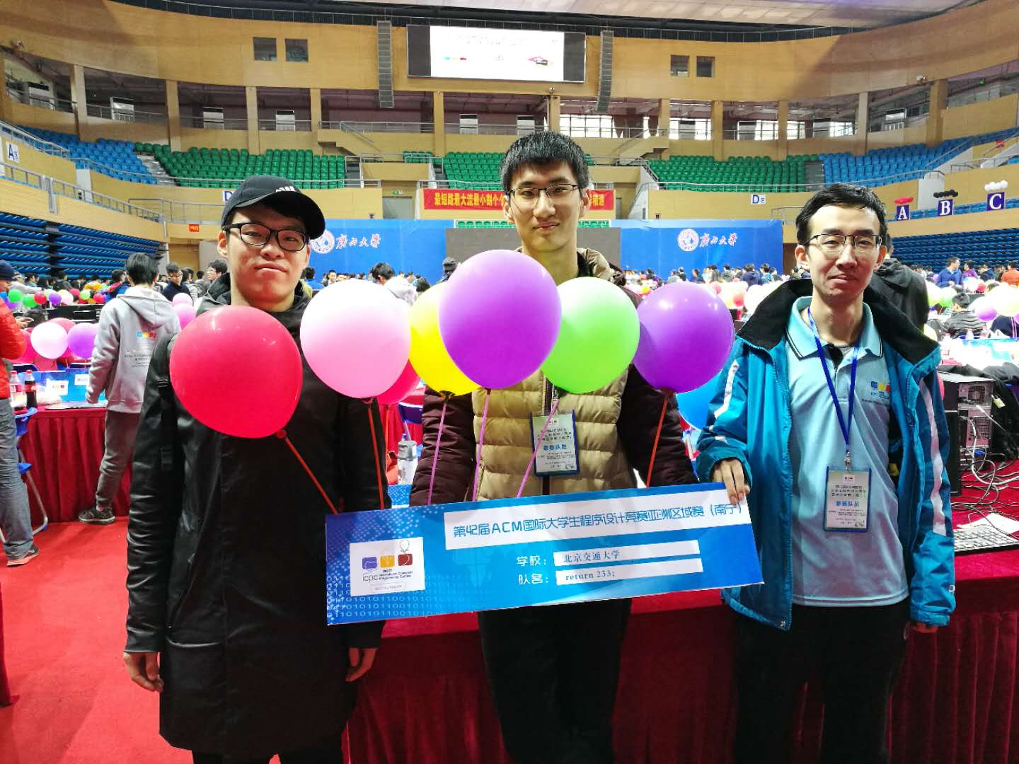 此次ACM-ICPC亚洲区域赛南宁站的比赛是由亚洲区组委会授权广西大学承办。参赛阵容非常强大,在前期网络赛筛选的基础上,来自北京大学、复旦大学、北京航空航天大学在内的152所高校的228支正式队伍参加了此次现场赛。最终,北京大学的“贝塔猫”队以解出13题中的11题的绝对优势捧得冠军奖杯,而西北工业大学以及复旦大学的队伍分别解出10题和9题获得亚军和季军奖杯。搜书吧 此次派出了两支参赛队伍,分别是由刘雅清(15281155)、金睿琦(16281041)、孙庆岩(17281162)组成的“永不沉落”队,和王楚涵(15281246)、梁伯翰(16281166)、杨东学(14275032)组成的“幻夜”队。经过五个小时的顽强拼搏,最终“幻夜”队以解出6题的成绩获得了一枚铜奖,“永不沉落”队与奖牌失之交臂。