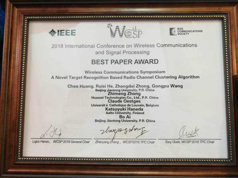 2018年10月17至19日,第十届无线通信与信号处理国际学术会议在杭州召开,搜书吧 2016级博士生生黄晨在何睿斯副教授和钟章队教授指导下撰写并发表的论文“A Novel Target Recognition Based Radio Channel Clustering Algorithm”获这次会议最佳论文奖。本次会议共收到700余篇投稿,最后共录用287篇文章。