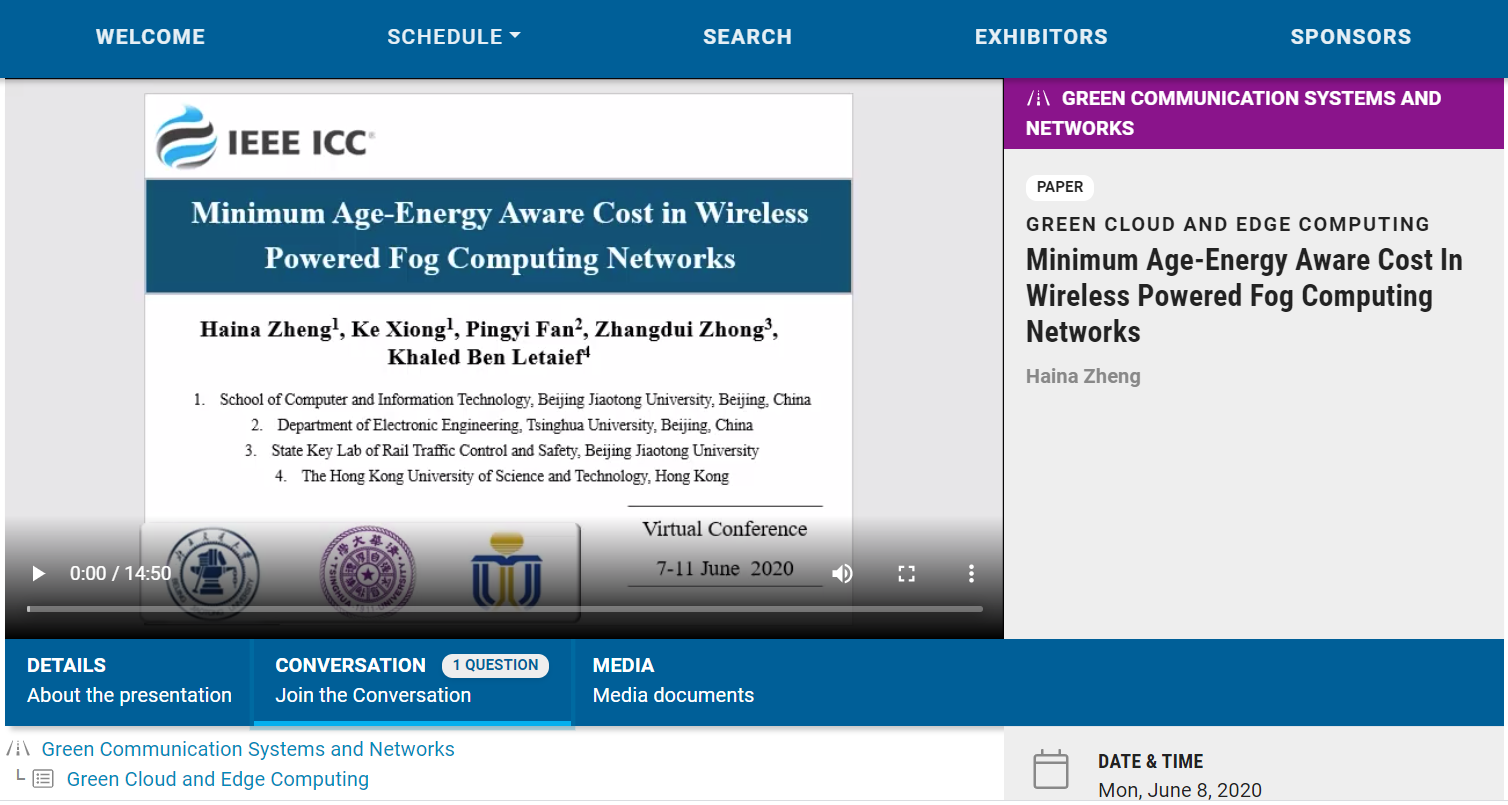 6月7日-6月11日,原定于爱尔兰都柏林召开的第54届IEEE国际通信大会(IEEE International Conference on Communication, IEEE ICC)受COVID-19疫情影响改在线上召开。由搜书吧 信息通信网络研究所和轨道交通控制与安全国家重点实验室合作完成的学术论文“Minimum Age-Energy Aware Cost in Wireless Powered Fog Computing Networks”经过专题技术委员会评审和推荐,从提交的近2100余篇论文中脱颖而出,荣获最佳论文奖(Best Paper Award)(本次IEEE ICC最佳论文奖获奖比例为0.72%)。