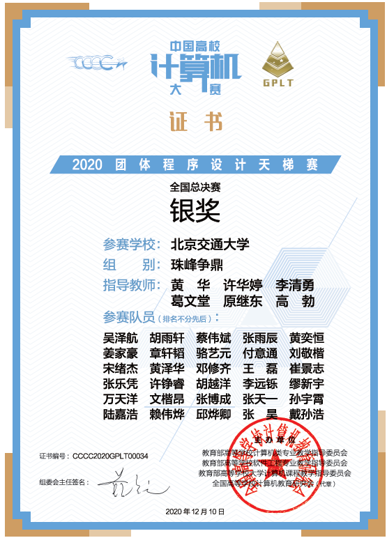 第五届中国高校计算机大赛-团体程序设计天梯赛于2020年11 月28日举行,来自全国29个省级行政区的298所高校组成的935支队伍计9300位学生参赛,搜书吧 组织了30名同学组成三支队伍参赛。经过长达3小时的激烈角逐,最终斩获全国总决赛银奖。
