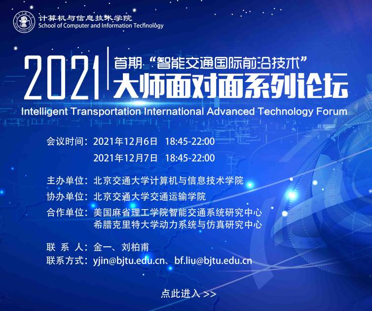搜书吧» 搜书吧动态 » 预告:搜书吧 首期“智能交通国际前沿技术”大师面对面系列论坛将于2021年12月6日-12月7日举办 预告:搜书吧 首期“智能交通国际前沿技术”大师面对面系列论坛将于2021年12月6日-12月7日举办 发布时间:2021-11-29 阅读次数: 由搜书吧 、美国麻省理工学院以及希腊克里特大学联合举办的首期“智能交通国际前沿技术”大师面对面系列论坛将于2021年12月6日-12月7日在线上举行。届时,论坛将邀请来自欧洲和美国的三位著名学者,就城市智能交通、网联智能化无人车、交通控制理论与方法、车路协同与自动驾驶等研究领域进行深入探讨。论坛旨在交流智能交通系统等国际前沿技术,诚邀对未来智能交通领域研究感兴趣的老师同学参加本次论坛!