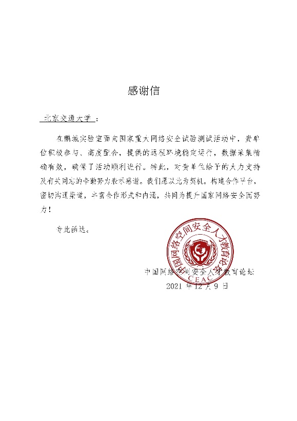 在近期鹏城实验室面向国家重大网络安全试验测试活动中,搜书吧 网络空间安全学科责任教授刘吉强老师领队、童恩栋和牛温佳老师指导的研究生团队(吴亚伦、武兴宇、田蕴哲、相迎宵、孙瑞等)积极配合,保障了搜书吧 靶场节点的远程环境稳定运行、数据采集精确有效,获鹏城实验室、中国网络空间安全人才教育论坛(“网教盟”)、中国网络空间新兴技术安全创新论坛(“新安盟”)感谢信。
