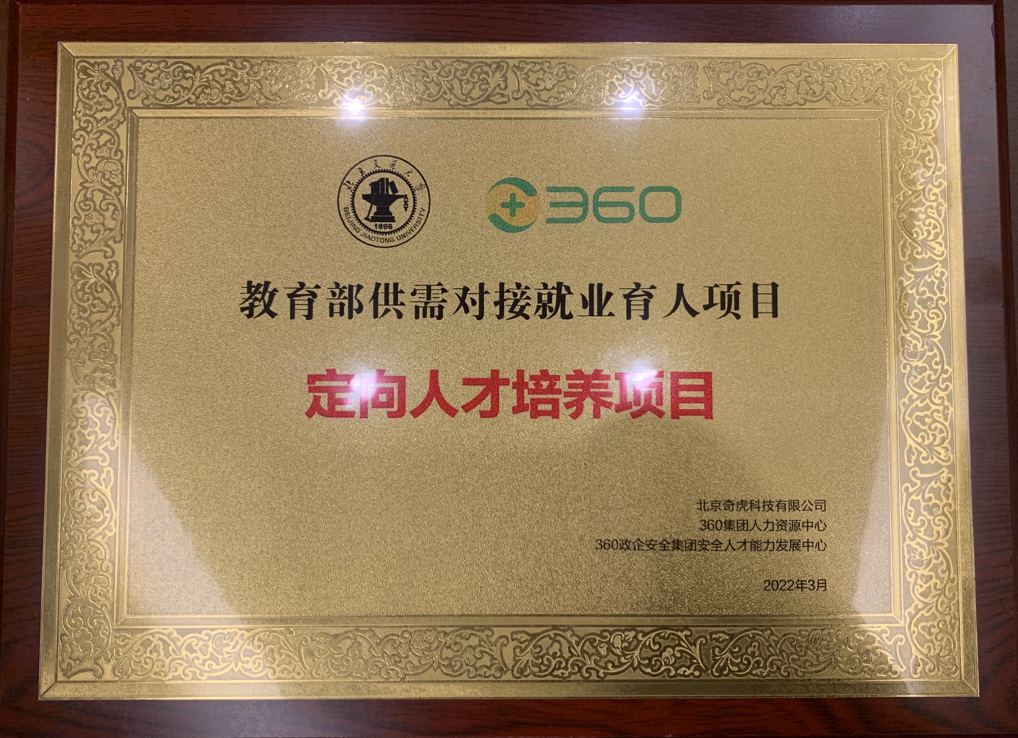 教育部高校学生司2021年首次实施供需对接就业育人项目,搜书吧 与360公司合作设立定向人才培养项目—搜书吧 信息安全专业人才培养和实践能力提升项目,面向大三大四学生进行专业实训课程培养,合办网络安全攻防特色定向人才培养班。