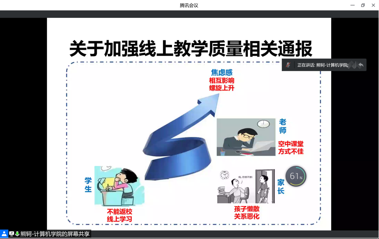 之后熊轲通报了前9周线上教学督导和学生的调研结果,强调当前疫情态势依然严峻,随着本学期线上教学活动的持续,学生、家长和老师都出现了一定程度的焦虑情绪,全院教师要重视线上课堂教学质量、加强与学生的在线互动及答疑、积极配合校院两级督导的听课和指导、及时向学院反馈线上教学出现的新情况,课程负责人要组织任课教师团队针对课程特点进行线上教学研讨、提前做好期末线上考试的预案,本科毕业设计导师要切实做好对学生的指导和毕设论文工作质量的把关,并对近期学院教学工作重点进行了说明和具体部署。他还指出,老师们要以本次专业认证为契机,深化对本科人才培养质量的理解,进一步规范课程的教学活动,把学院本科教学工作质量推向新的高度。