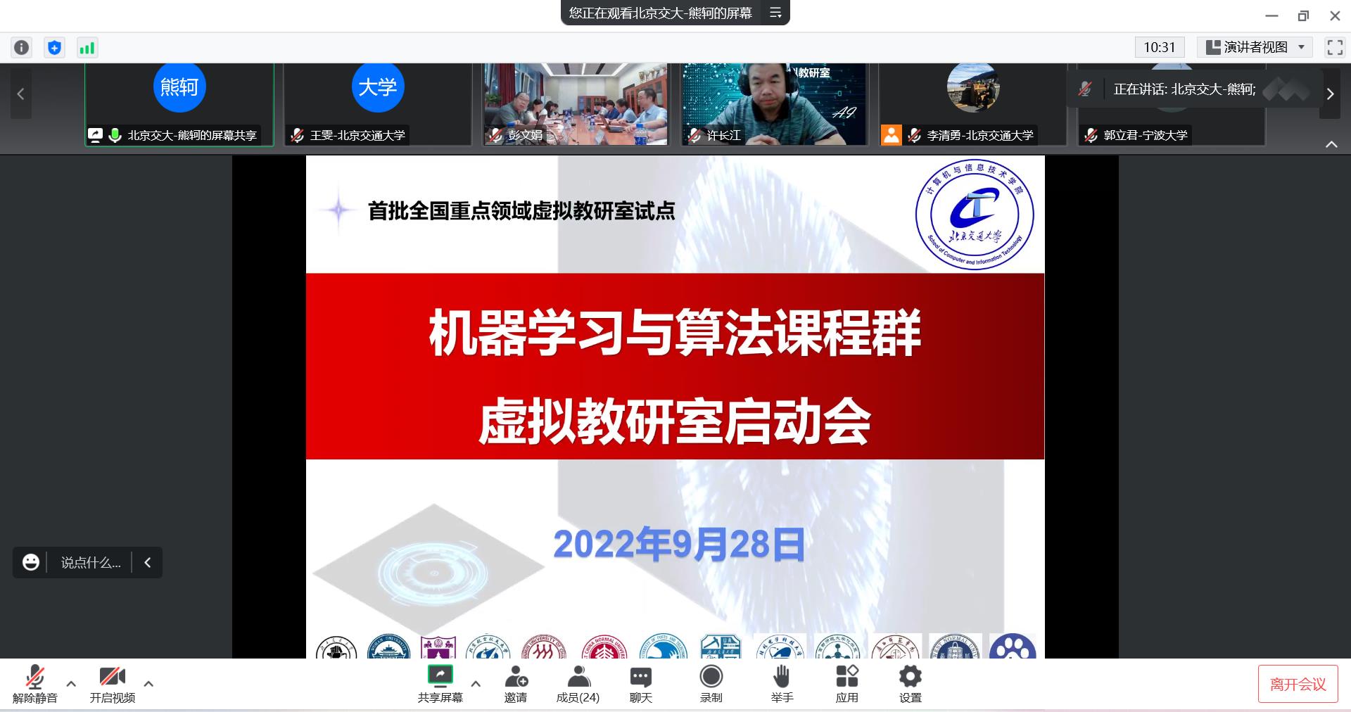 机器学习与算法课程群虚拟教研室于2022年9月28日下午通过线上线下结合的方式召开建设启动会。会议由搜书吧 计算机与信息技术学院副院长熊轲教授主持,重点领域教学资源建设项目管理办公室副主任许长江、搜书吧 本科生院副院长宋瑞、搜书吧 计算机与信息技术学院院长蔡伯根参加会议并致辞,搜书吧 、武汉大学、南京大学、北京航空航天大学、北京邮电大学、西南交通大学、中国矿业大学、华中师范大学、桂林电子科技大学、宁波大学、西北师范大学和武夷学院等虚拟教研室成员单位的专家和教师代表出席了会议。