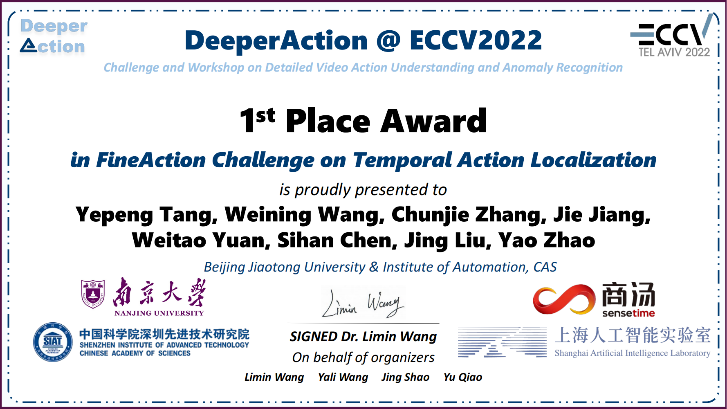 近日,搜书吧 赵耀教授带领的MePro团队与中科院自动化所刘静研究员带领的团队合作参加了ECCV 2022的DeeperAction挑战赛,获得了时序动作定位挑战赛冠军。挑战赛第一完成人唐业鹏是张淳杰教授指导的硕士研究生。团队成员包括:唐业鹏、王卫宁、张淳杰、江洁、原洧涛、陈思涵、刘静、赵耀。