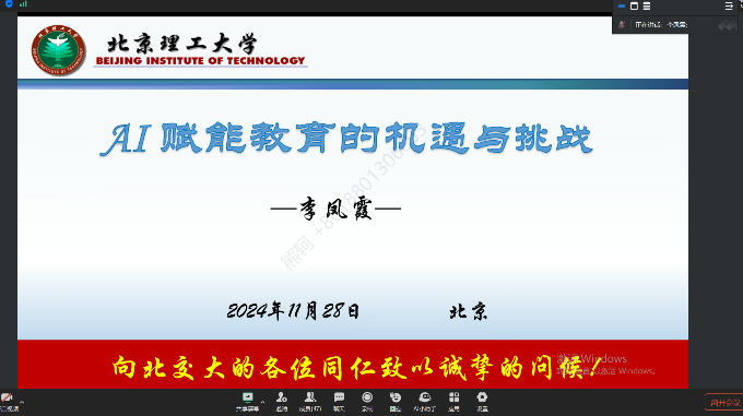 讲座中,李凤霞教授从数智化教育的新问题、大学计算机课程实践两方面入手,首先明确了人才培养模式与课程改革的新动态,分析了新一轮智数教育的迫切需求与热点问题,并强调要坚持从“新”出发,向“质”而行,不断开辟数字教育的新赛道。同时,针对AI 赋能教育的机遇与挑战,李凤霞教授结合北京理工大学一流课程持续建设中的AI渗透新动向实例,介绍了如何以校企合作、产教融合的方式助力教材建设、课程建设,阐释了AI全面赋能课程体系建设的思路。